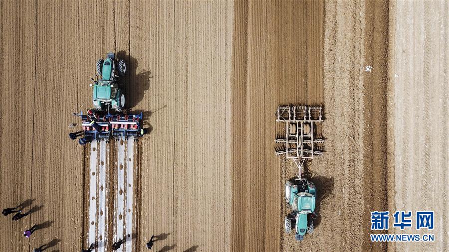 3月23日,“智能拖拉機”在新疆庫車縣牙哈鎮的一處棉田中進行精細化作業(無人機拍攝)。新華社記者胡虎虎攝